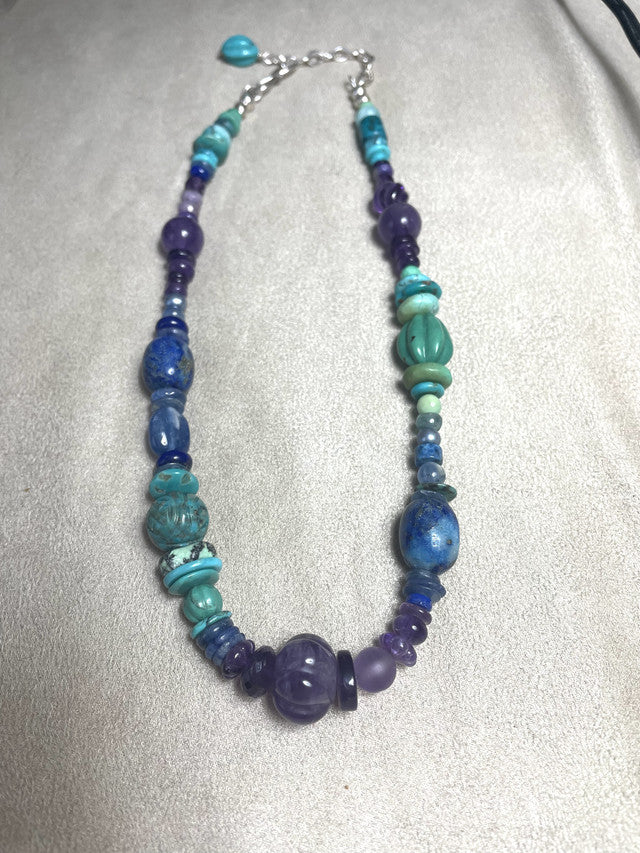 Carved Amethyst and Turquoise,Lapis and various shapes and colors of said stones! Really beautiful mixed hues of the Santa Fe evening sky! You will love it!