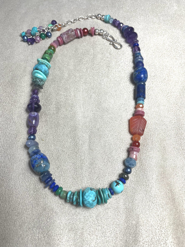 Turquoise, blue, purple, pink and orange create a lively colorful piece . It can accent many styles and hues in clothing. Lapis, Turquoise, Cornelian, Amethyst and pink Tourmaline make up the colors of the Santa Fe evening sky!