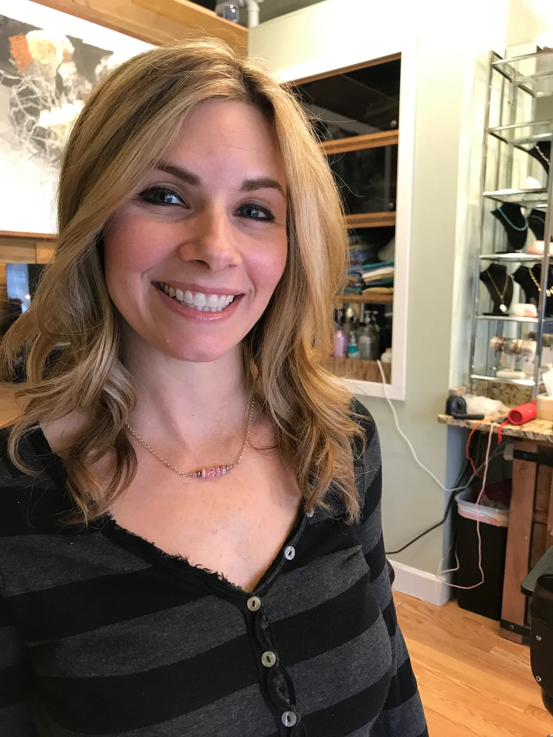 This simple, elegant necklace has soft pink rhodochrosite stones surrounding the double terminated Herkimer diamond crystal and its ends capped with intricate Bali beads.